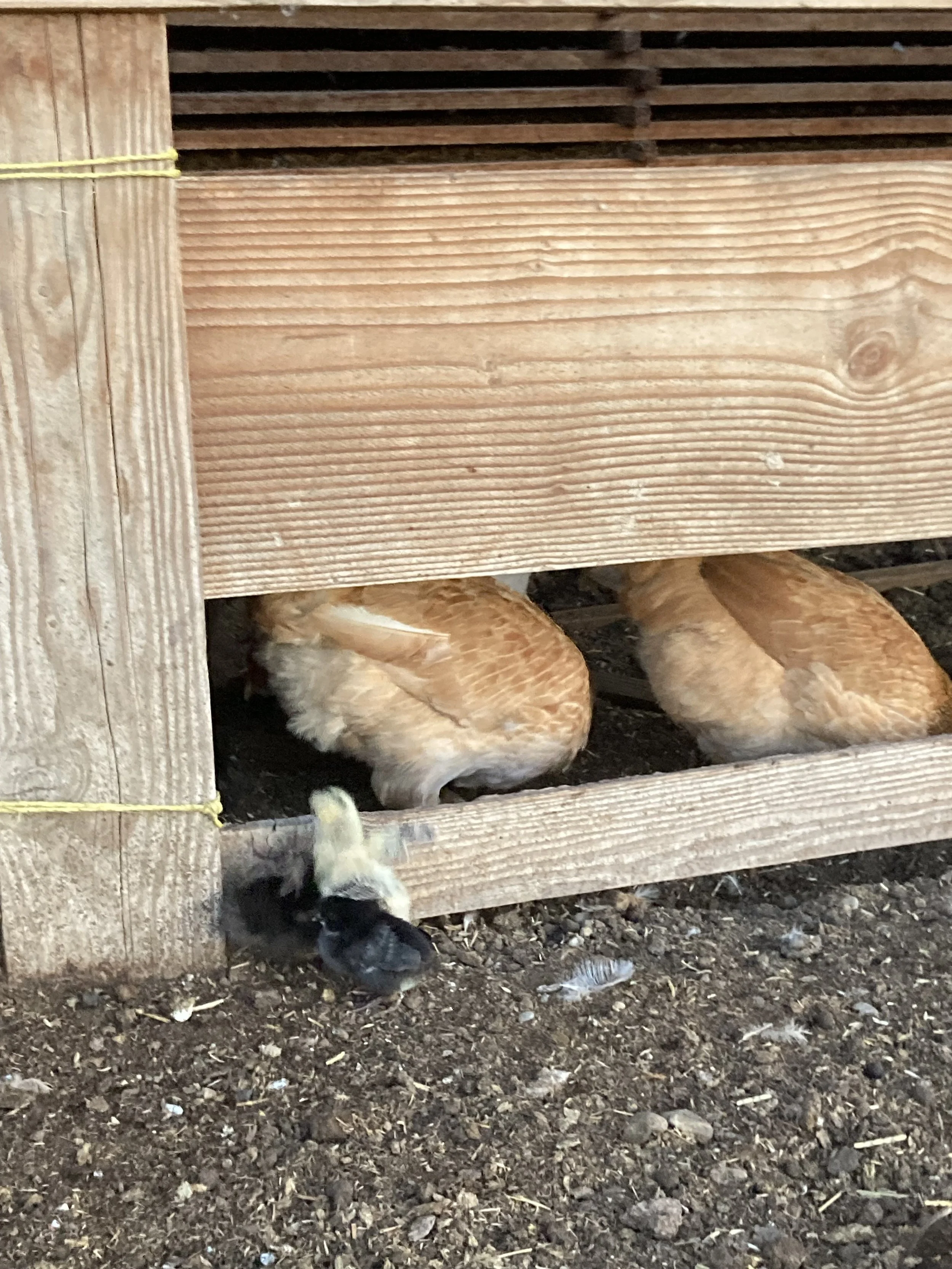 A couple of days after the chicks appeared, they were wandering along the board fence that is the south side of the barn.