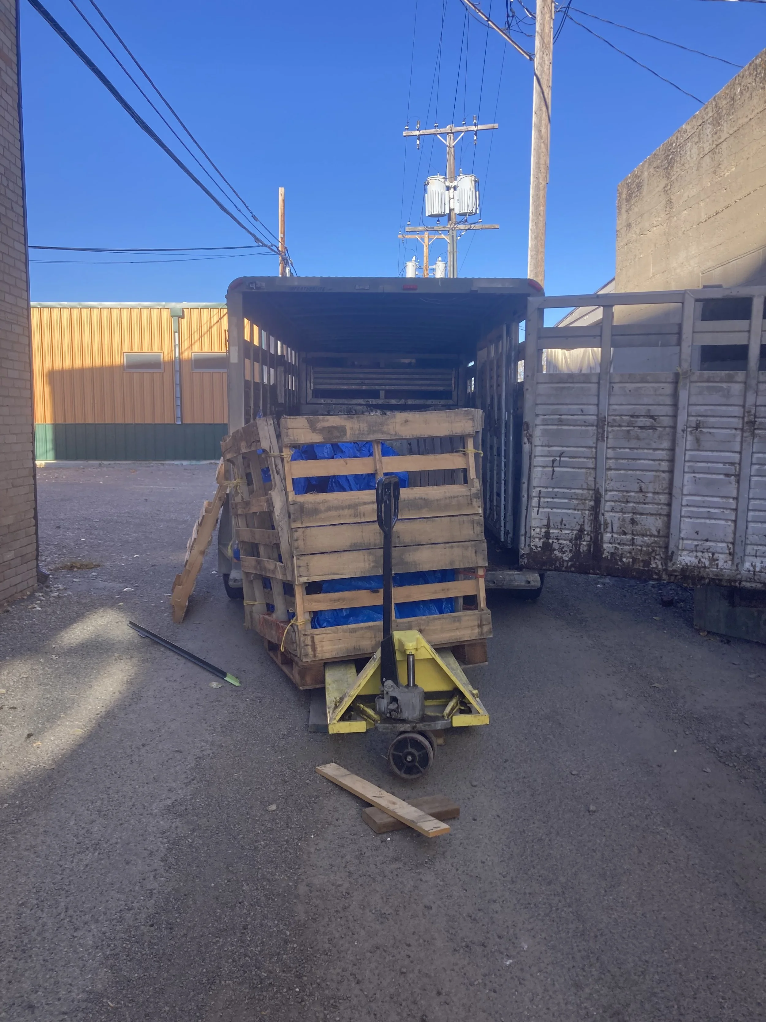 I managed to load the boxes with the tractor without mashing the trailer door, but my plan to use a pallet as a ramp when I arrived at the building didn’t work.