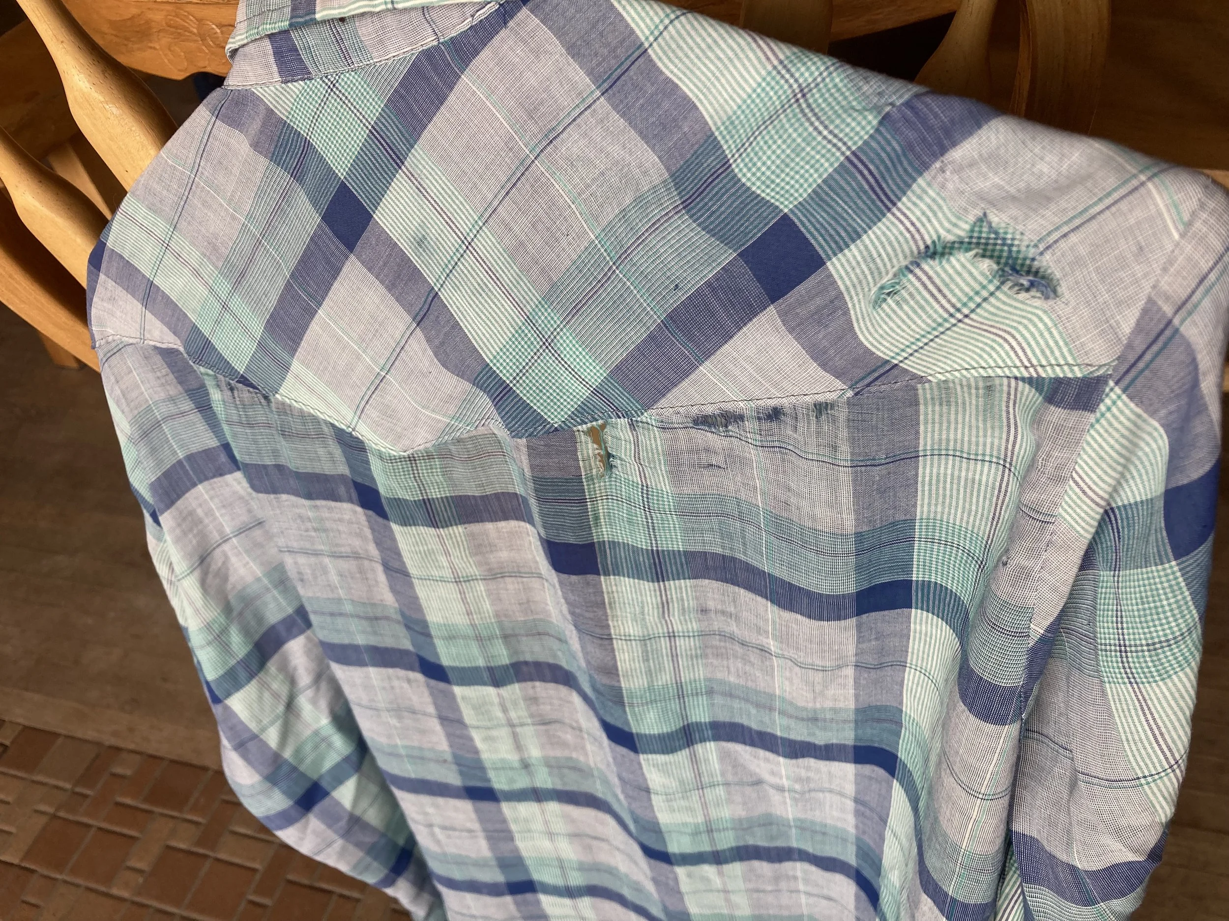 Plaid with long sleeves and snaps, I bought it when I worked on Utah desert ranch to wear when we trailed cattle down the highway.