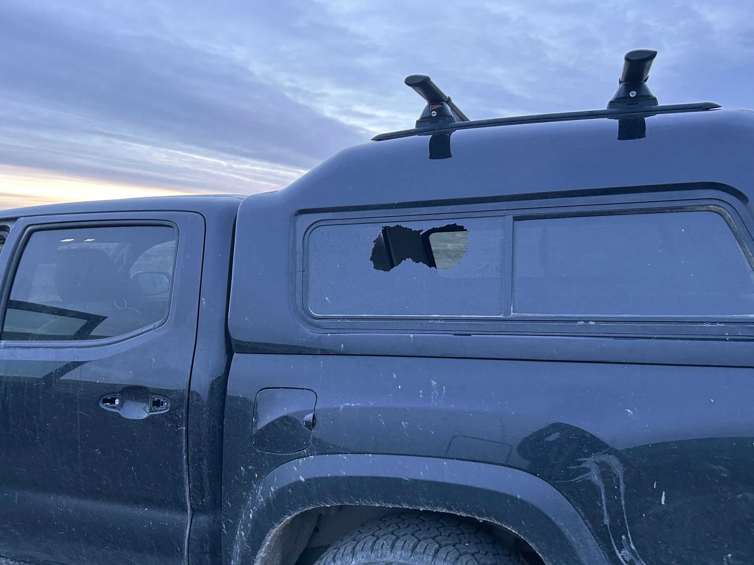 Later, I discovered shattered glass and gravel inside my pickup topper.