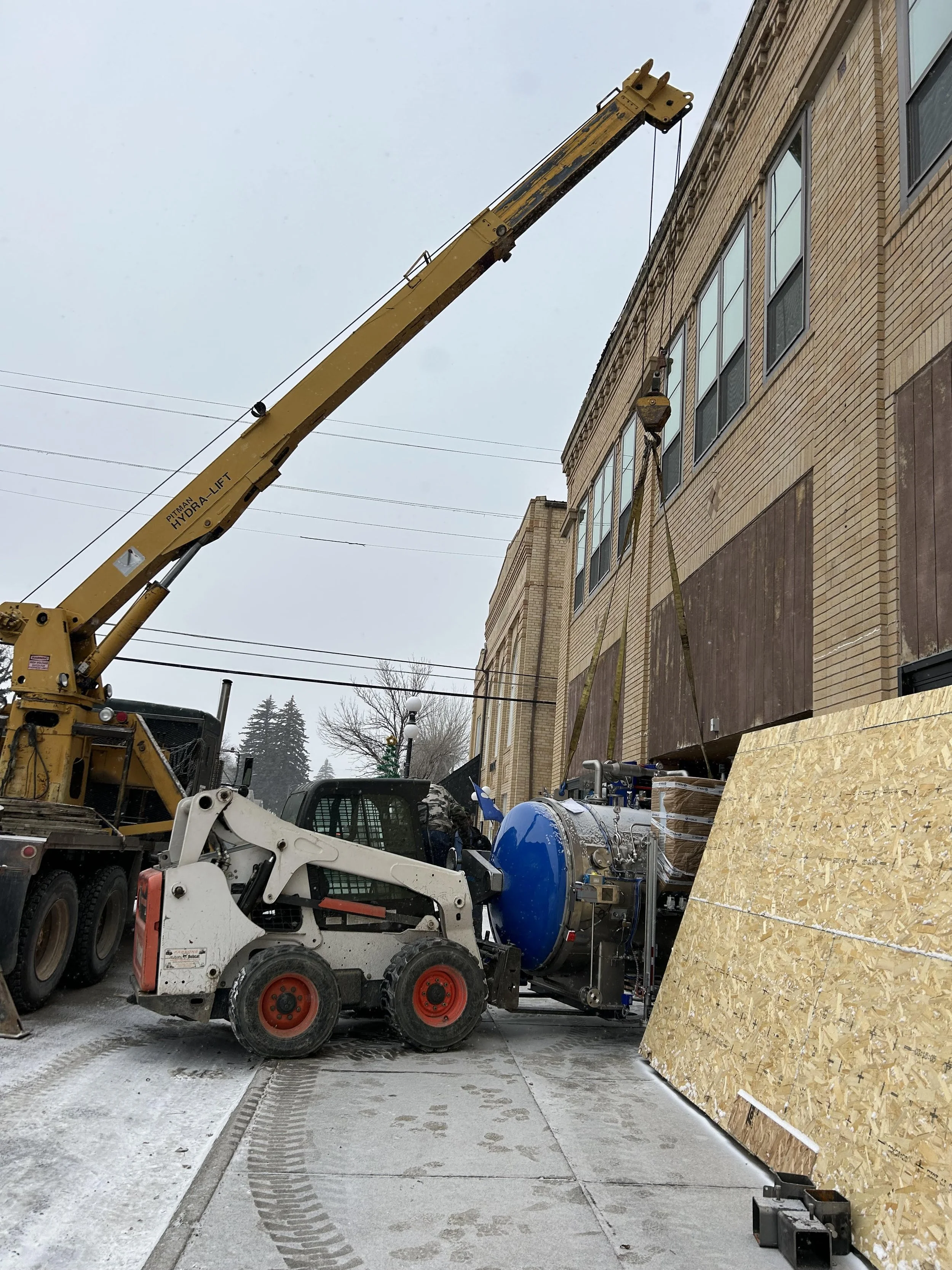 Then the competent crew lined up a forklift that could lift half of the weight in the front of the retort pallet and a skid steer that could lift the other half in the back.